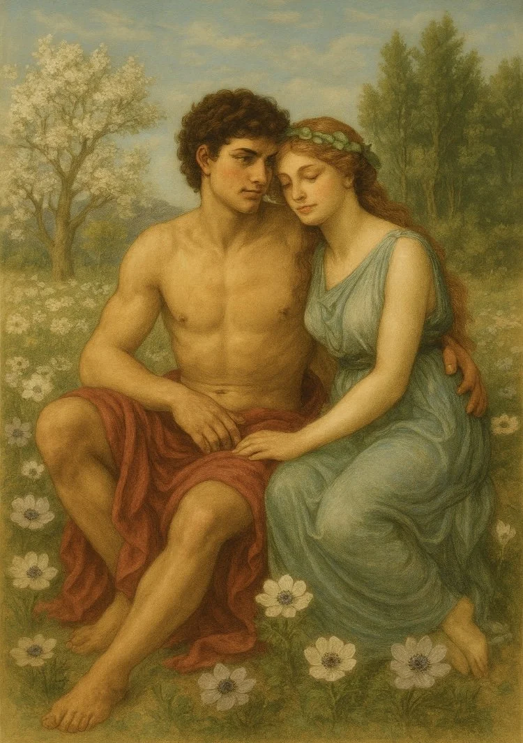 Moved by Aphrodite’s grief, Zeus allowed Adonis to return - not as a god, but as a spirit of the seasons. Each year he would rise again, echoing the cycle of life, death, and rebirth. As a springtime god, his return brought flowers to bloom and hearts to stir. And each year, he would descend once more, into Persephone’s realm, into stillness and shadow.
