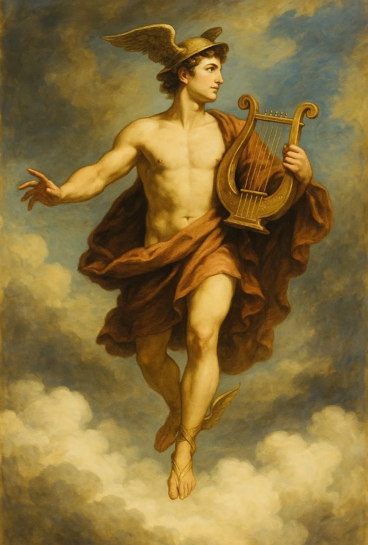 He was the son of Zeus and Maia, the daughter of Atlas and one of the Pleiades. According to myth, he was born in a cave on Mount Cyllene in Arcadia, a wild and sacred land in southern Greece. From the moment of his birth, he was extraordinarily gifted and precocious. That very day, he escaped his cradle, crafted the lyre from a tortoise shell, and stole Apollo’s cattle. When confronted, he charmed Apollo with the music of his new instrument, and the two half-brothers became friends.